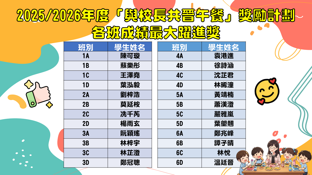 為了表揚同學於第二段考中有顯著進步的同學,關校長特邀同學一起共晉午餐,並送上禮物以表奬勵。
