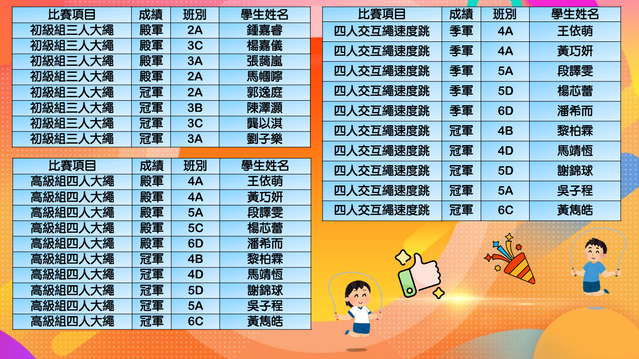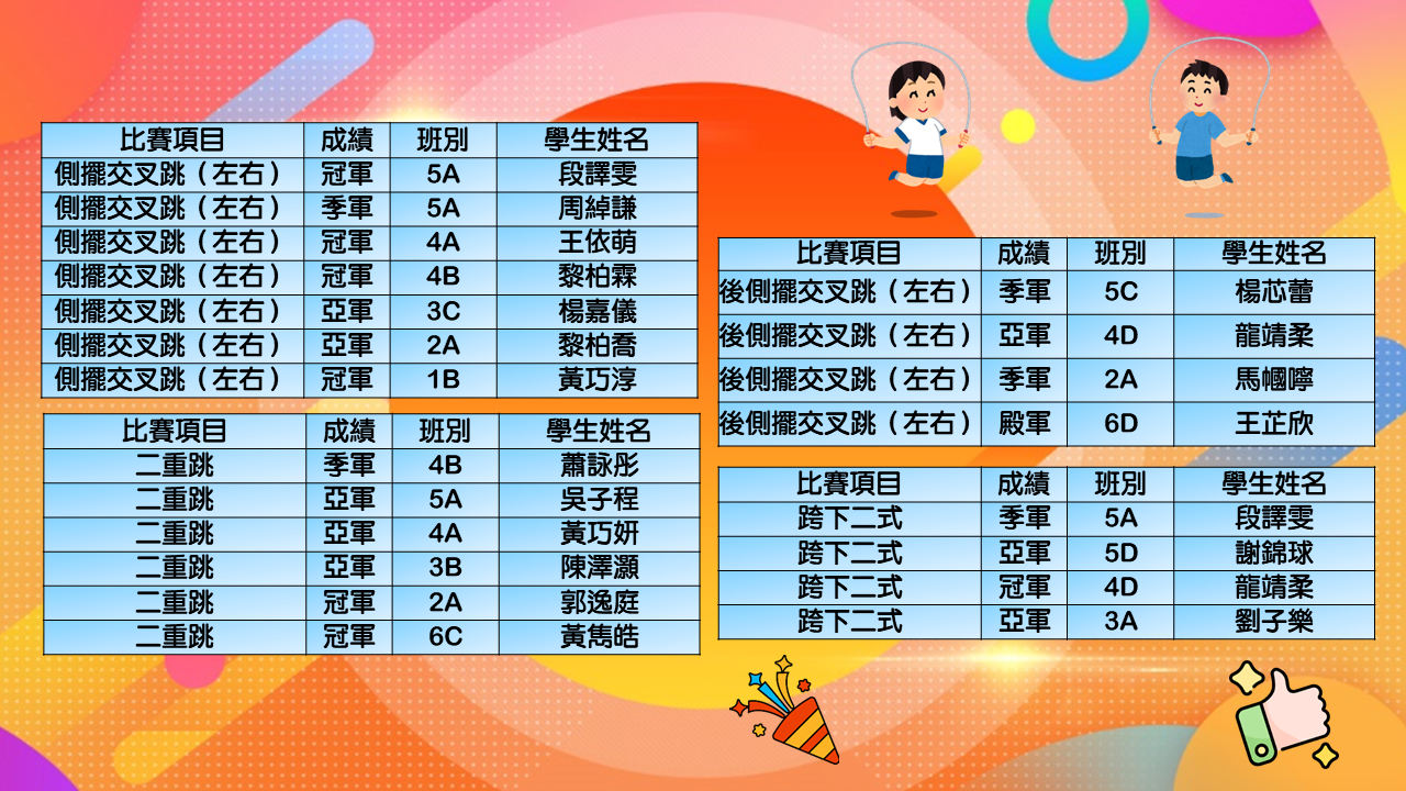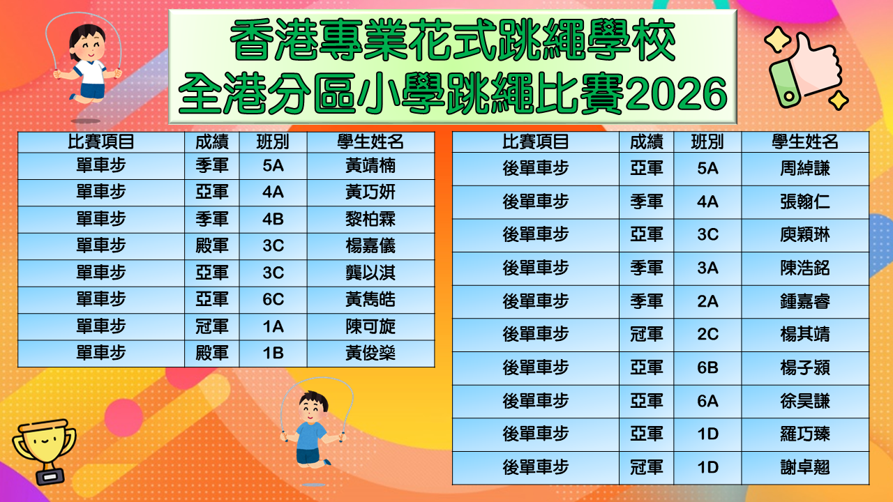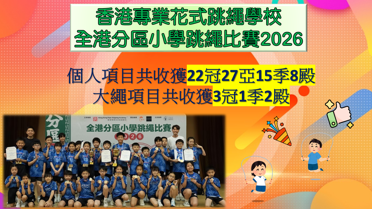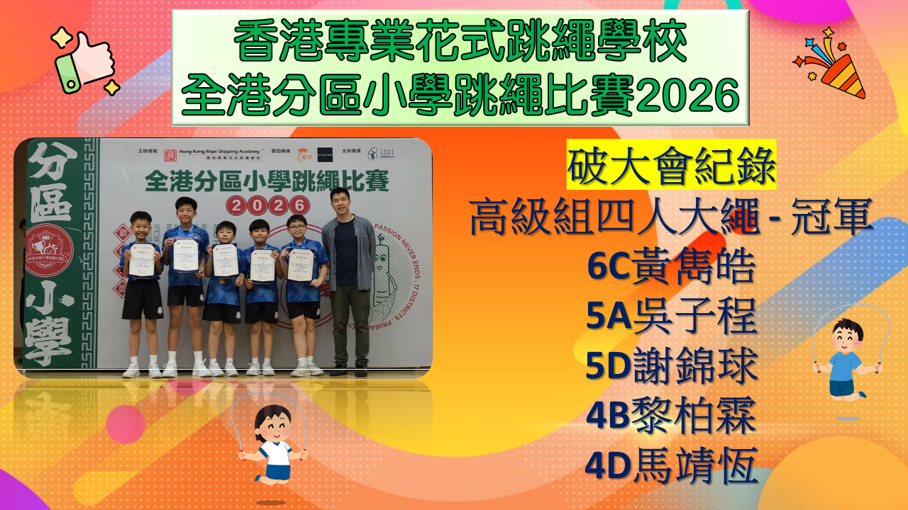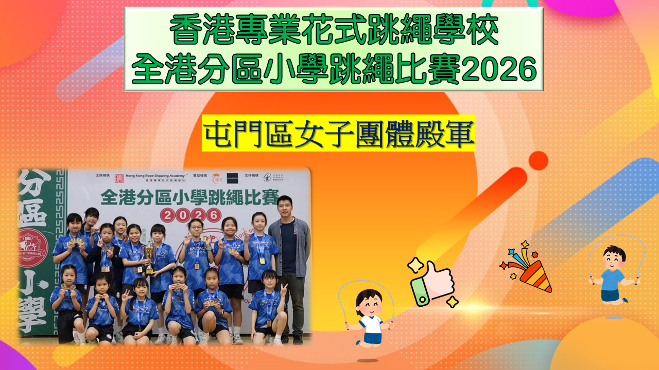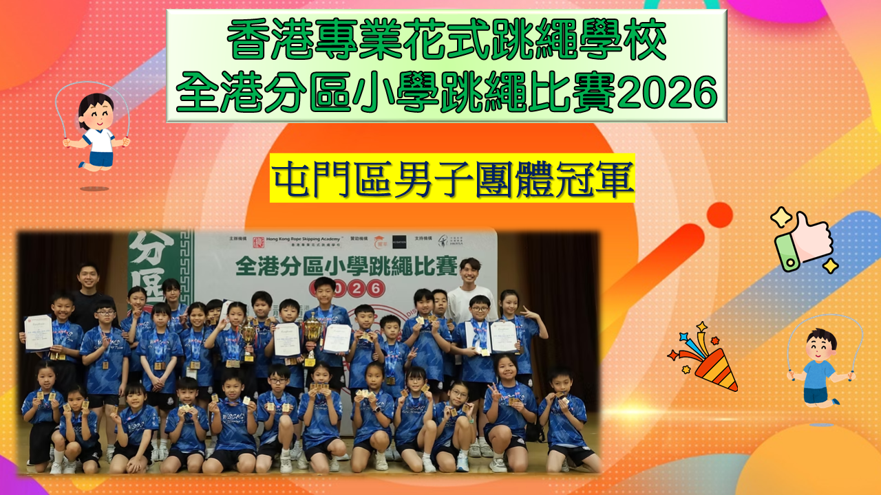 在同學努力作賽下,伍時暢跳繩隊最終獲得屯門區團體女子組殿軍及團體男子組冠軍殊榮。再次恭喜各位獲獎同學,亦感謝家長的支持及教練的教導。