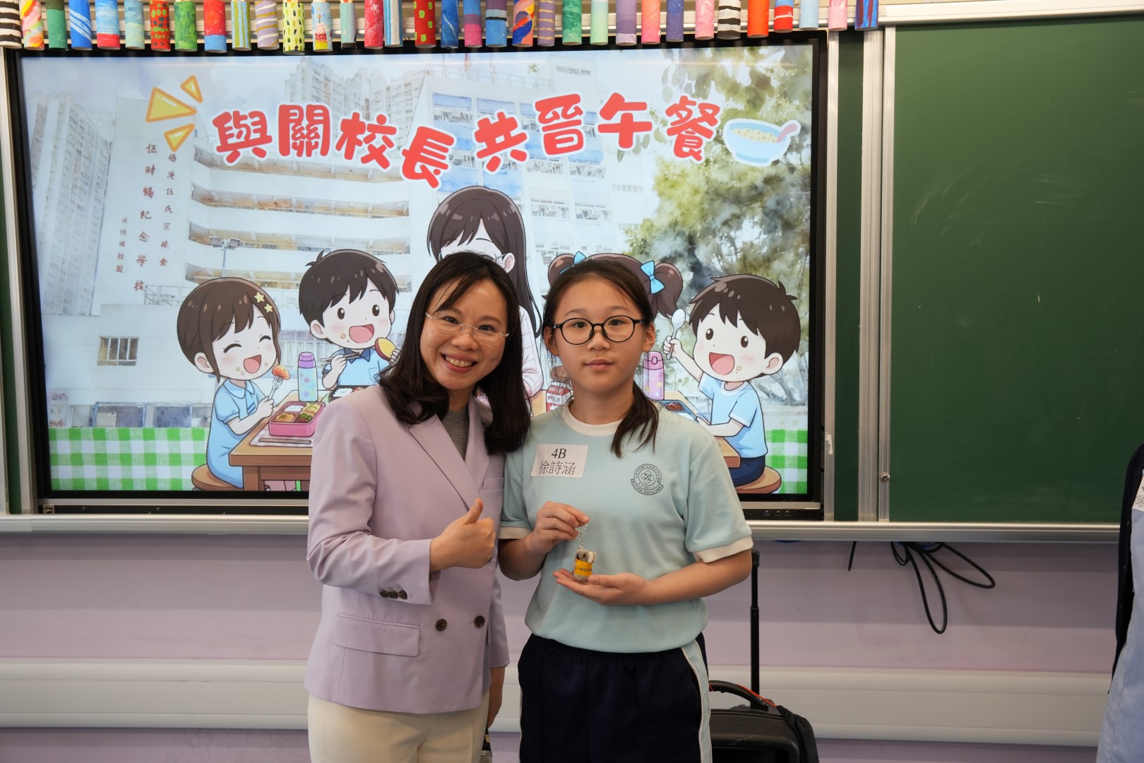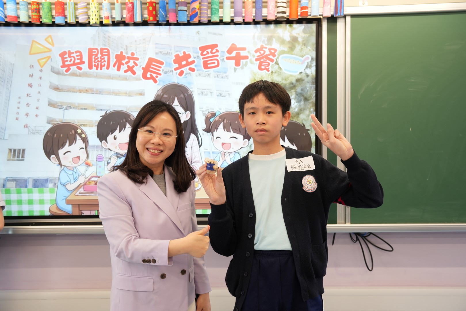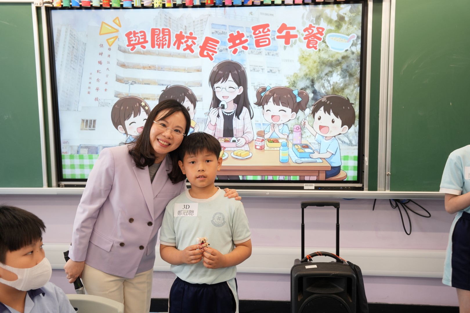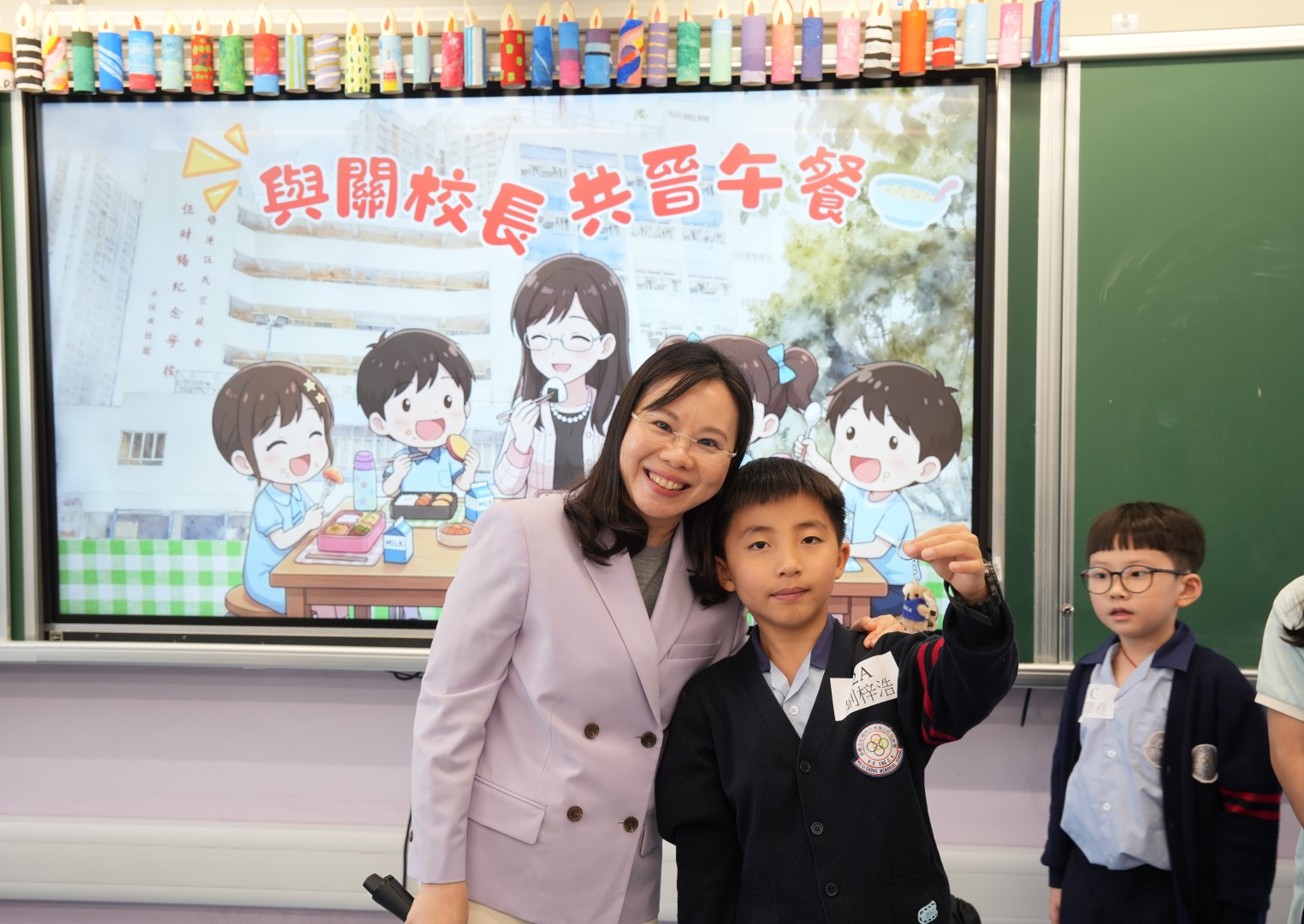 為了表揚同學於第二段考中有顯著進步的同學,關校長特邀同學一起共晉午餐,並送上禮物以表奬勵。