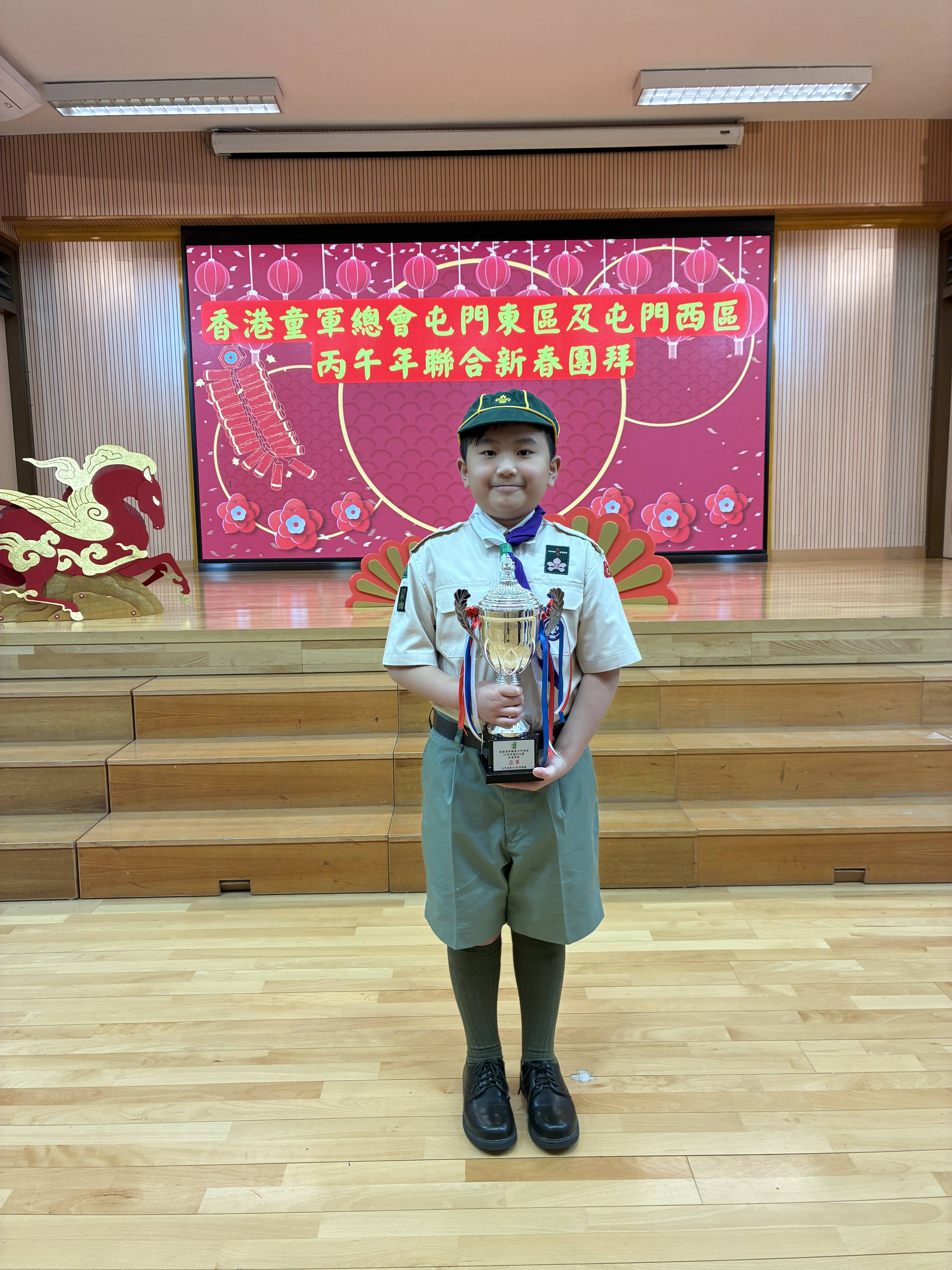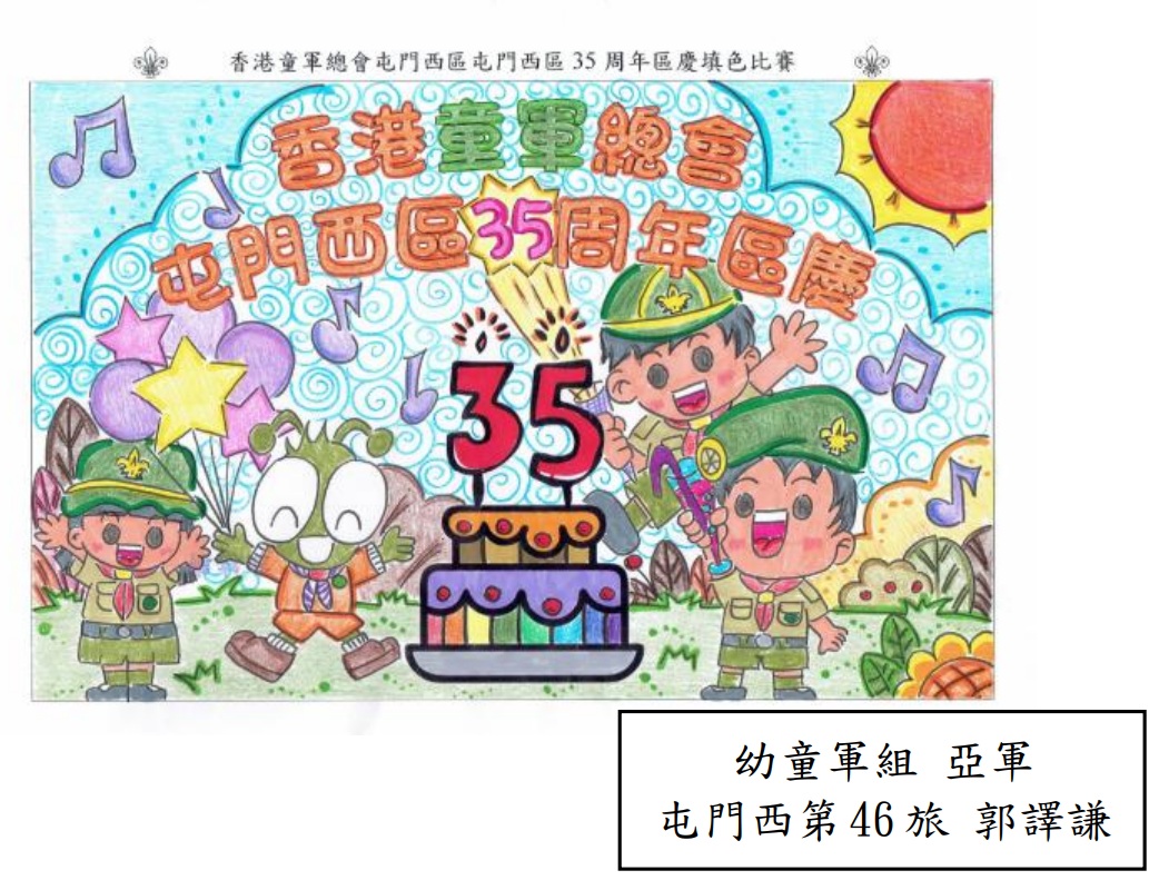 4C郭譯謙在「屯門西區35周年填色及紀念章設計比賽」中獲得填色比賽幼童軍組亞軍,獎項已於「屯門東區及屯門西區丙午年聯合新春團拜」中頒發,本校旅長關倩芬校長亦有到場參與頒獎儀式。恭喜郭同學在比賽中獲獎,並與各位家長和同學分享郭譯謙的獲獎作品。